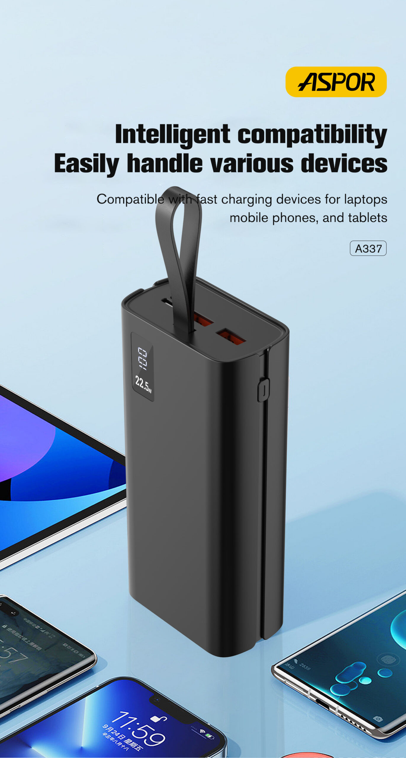 اشحن أجهزتك بثقة أينما كنت مع باور بانك ASPOR A337 ذو السعة الكبيرة والأداء القوي.